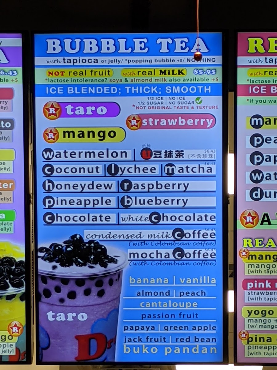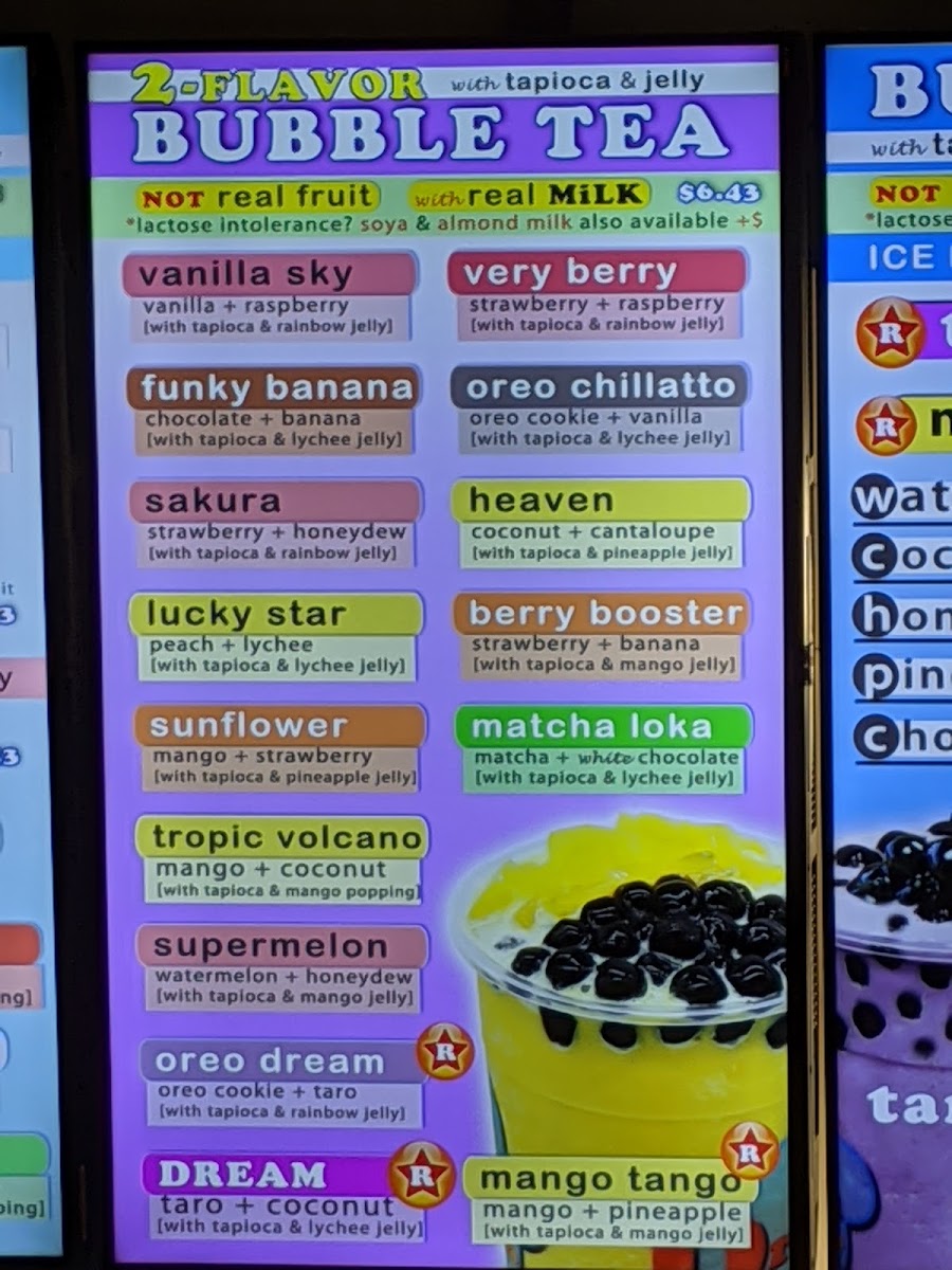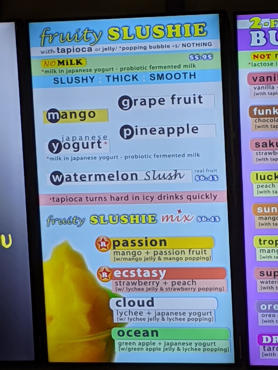 A non-dairy ice-blended, thick, smooth slushy mixing 2 fruity flavors comes with jelly & popping bubbles or your personalized toppings.